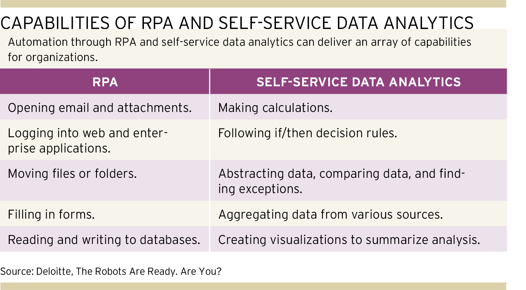يتطلب التميز التنافسي تنفيذ تقنيات تحليلات البيانات والأتمتة، مثل أتمتة العمليات الآلية (RPA) وتحليلات بيانات الخدمة الذاتية. تسمح هذه التقنيات للمؤسسات بجمع وتحليل البيانات من مجموعات البيانات الضخمة التي تكون كبيرة جدًا بحيث لا يمكن تجميعها في تطبيقات قواعد البيانات وجداول البيانات. في بعض الحالات، يمكنهم تنزيل إصدار تجريبي وإنشاء قواعد بيانات بسرعة.
