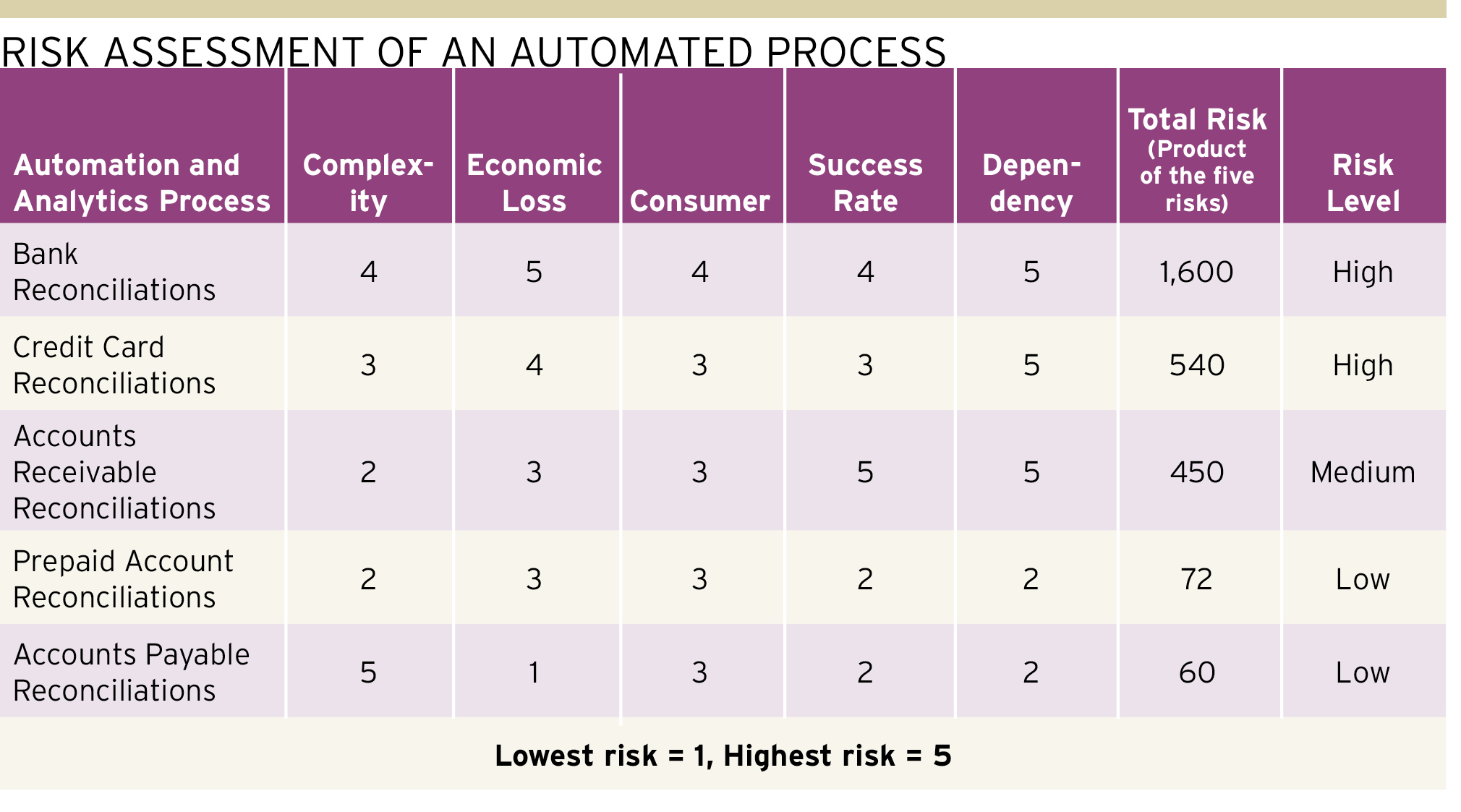 "تقييم مخاطر عملية مؤتمتة" (أدناه) هو مثال على كيفية تطبيق بطاقة قياس الأداء في قسم المحاسبة أو الشؤون المالية. يتم تسجيل كل خطر فريد لنشر الأتمتة وفقًا لخمسة أبعاد فريدة لبيئة التشغيل الآلي لتلك الوظائف. يمكن للمدققين الداخليين استخدام هذه الطريقة لتقييم مخاطر نشر كل مشروع أتمتة فردي، والذي يرتبط عادةً بعملية محددة مثل التسوية المصرفية.