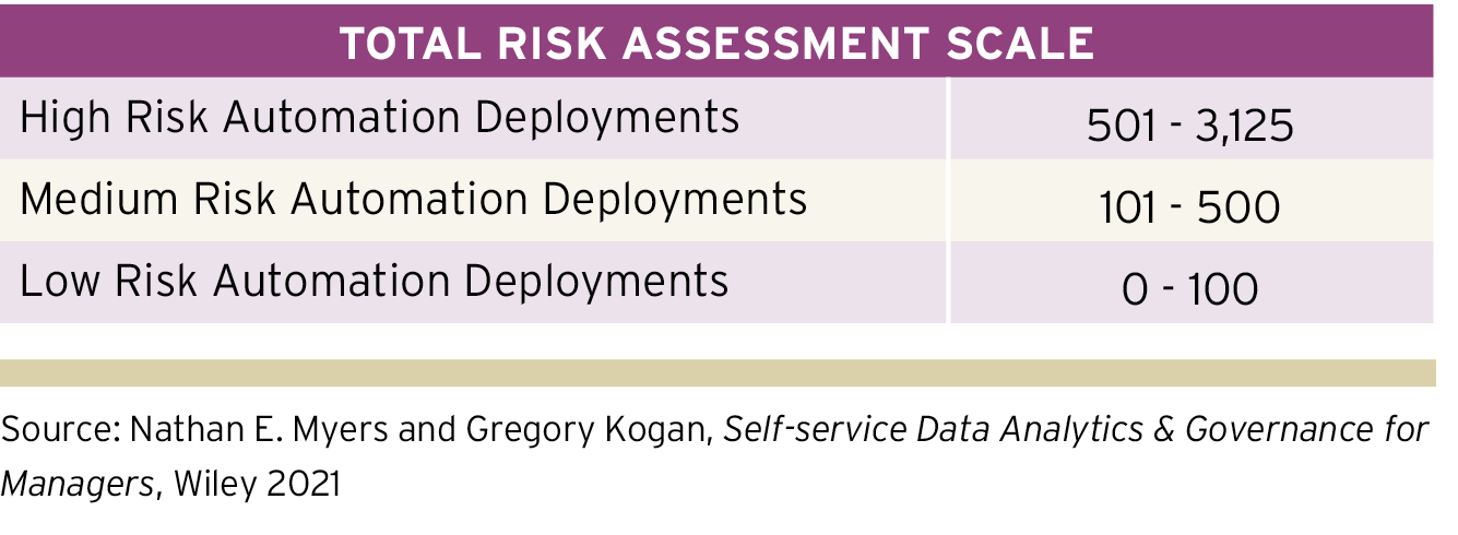 نظرًا لأن كل نشر آلي يحتوي على درجة مختلفة من المخاطر المتعلقة بالتعقيد، والخسارة الاقتصادية، والمستهلك النهائي، ومعدل النجاح، والاعتماد، فإن كل مشروع سيحمل درجة مخاطر عبر هذه الأبعاد الخمسة. من خلال توثيق المخاطر الإجمالية للمشاريع الفردية والعمليات ذات الصلة، يمكن للمدققين الداخليين تزويد الإدارة بشفافية المخاطر على محفظة الأتمتة وتصميم الاستجابات للمخاطر بشكل استراتيجي.