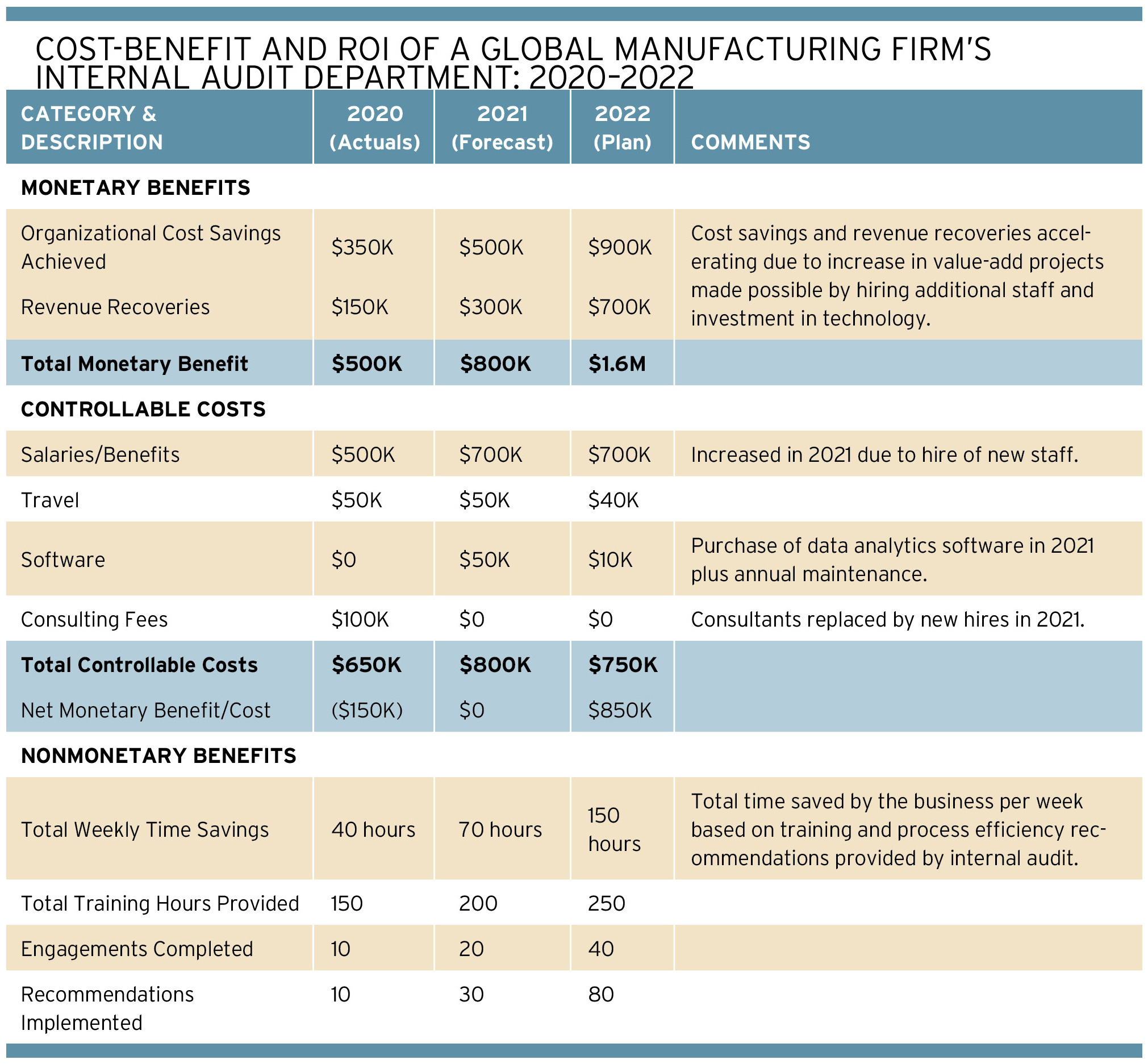 في هذه الحالات، قد يكشف تحليل التكلفة والفائدة مع عرض مدته عام واحد عن صورة أكثر قتامة من الواقع. بينما تستخدم تقارير الميزانية التقليدية آراء ربع سنوية وسنوية، فإن تحليل التكلفة والعائد على المدى الطويل قد يرسم صورة أكثر دقة لوظيفة التدقيق الداخلي ومسارها. في قسم "التكلفة-الفائدة \ Cost-Benefit والعائد على الاستثمار ROI لقسم التدقيق الداخلي لشركة تصنيع عالمية: 2020-2022" (الصورة بالأسفل)، يبدو أن وظيفة التدقيق الداخلي تعمل في عجز، أو على الأقل من منظور التكلفة والفائدة النقدية. ومع ذلك، نظرًا للاستثمارات في الموظفين والتكنولوجيا التي تستمر في توسيع عروض خدمات القيمة المضافة للإدارة وتحسين عمق وجودة العمل، فمن المتوقع أن يبدأ عائد استثمار إيجابي ومستدام في العام التالي.