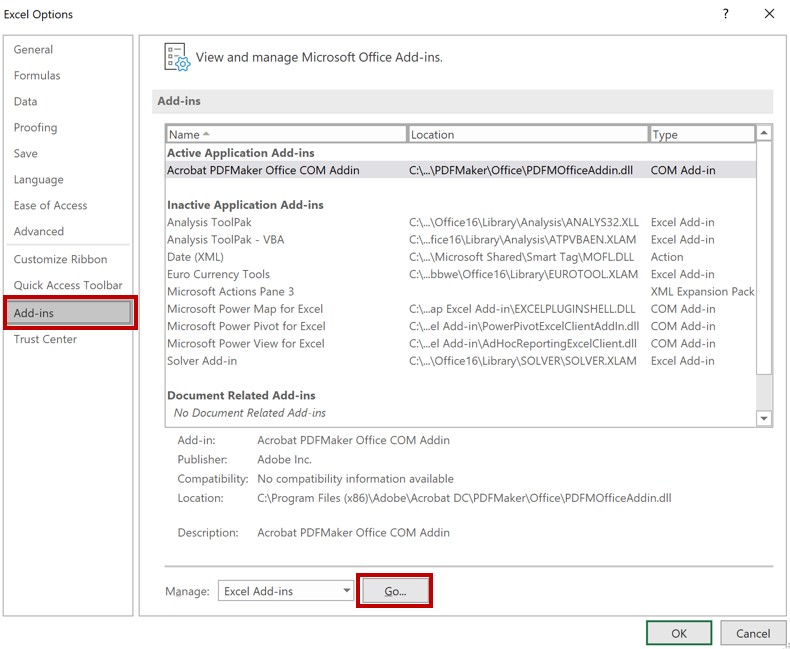 انقر فوق الوظائف الإضافية\ Add-Ins ثم Go….