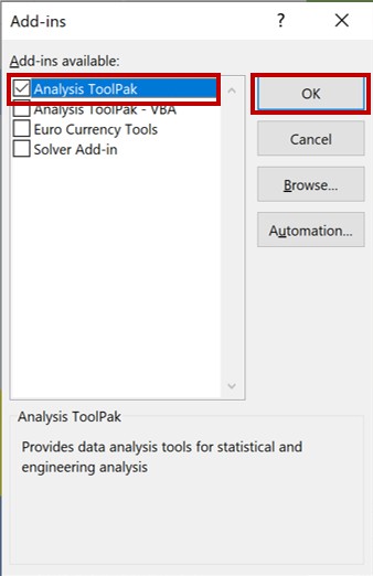 هذا يفتح نافذة منبثقة إضافية تسمح لك بتحديد حزمة أدوات التحليل. بعد تحديد الوظيفة الإضافية، انقر فوق "موافق".