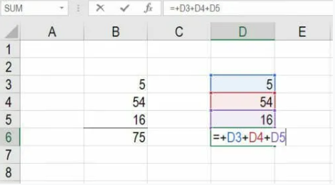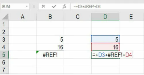 يوجد أدناه مثال على كيفية إنشاء خطأ REF Excel# بدون قصد حيث تُظهر الصورة الأولى ثلاثة أرقام يتم جمعها معًا (5 و 54 و 16). في العمود D، نعرض الصيغة التي تضيف الخلايا D3 و D4 و D5 معًا للحصول على 75.