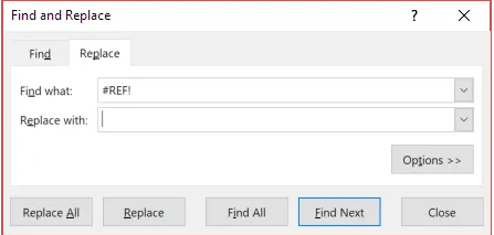 أفضل طريقة هي الضغط على Ctrl + F (المعروفة باسم وظيفة البحث) ثم تحديد علامة التبويب التي تقول استبدال  اكتب “!REF#” في حقل "بحث" واترك حقل "استبدال" فارغًا، ثم اضغط على " استبدال الكل " سيؤدي ذلك إلى إزالة أي أخطاء REF Excel# من الصيغ وبالتالي حل المشكلة