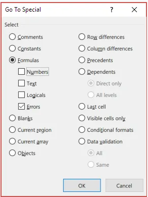 عندما تظهر قائمة Go To Special، حدد Formulas، ثم حدد فقط المربع الذي يشير إلى الأخطاء. انقر فوق "موافق" وسيأخذك ذلك تلقائيًا إلى كل خلية بها !REF# خطأ فيه.