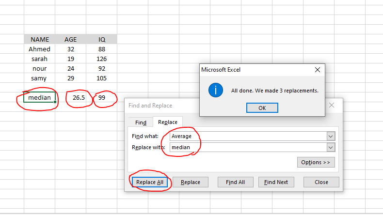 يوجد أدناه مثال على كيفية استخدام "بحث واستبدال" لتغيير معادلات SUM في الجدول أدناه لتصبح جميعها صيغ MEDIAN.