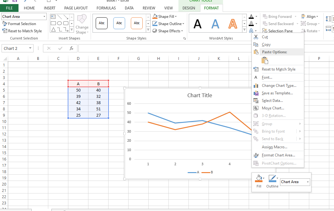 انقر بزر الماوس الأيمن على الرسم البياني وستظهر قائمة جديدة. في هذه القائمة، يمكنك تغيير نوع المخطط أو تحديد البيانات أو تنسيق منطقة المخطط