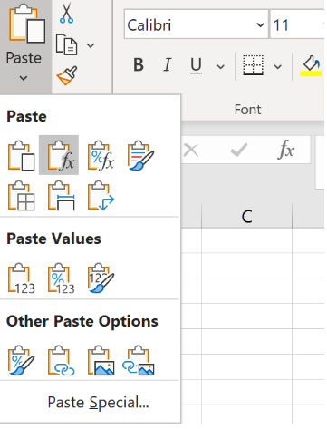 يساعد تحويل الصيغ غير الضرورية إلى قيم أيضًا على تقليل حجم الملف. يمكن القيام بذلك عن طريق نسخ الخلايا المحددة ولصقها كـ "قيم" ضمن علامة التبويب "خيارات اللصق". الاختصار لهذه الخطوة هو Ctrl + Alt + V + V.
