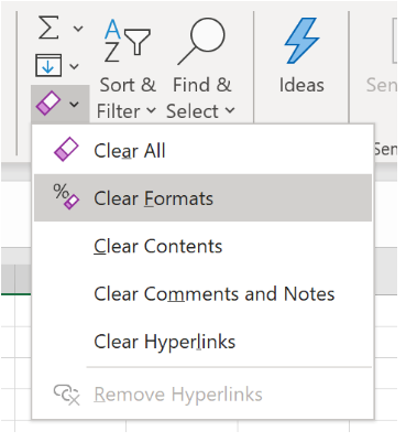 يمكنك استخدام الزر "مسح التنسيقات" في قسم "التحرير" ضمن علامة التبويب "الصفحة الرئيسية" لمسح تنسيقات الخلايا المحددة.
