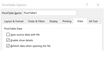 إحدى الطرق هي حذف Pivot Cache مع الاحتفاظ ببيانات المصدر. يمكن القيام بذلك عن طريق إلغاء تحديد "حفظ بيانات المصدر مع ملف" ضمن علامة التبويب "البيانات" في "خيارات PivotTable". يمكنك تحديد "تحديث البيانات عند فتح الملف" ضمن علامة التبويب نفسها للسماح لبرنامج Excel بتعميم ذاكرة التخزين المؤقت المحورية تلقائيًا عند فتح الملف أو تحديث الجدول المحوري يدويًا.