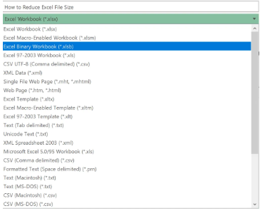 عادةً ما يتم حفظ ملفات Excel بتنسيقات XML (.xlsx أو .xlsm) دون تحديد. يمكن أن يؤدي اختيار التنسيق الثنائي (.xlsb) أثناء حفظ الملف إلى تقليل حجم الملف بشكل كبير.