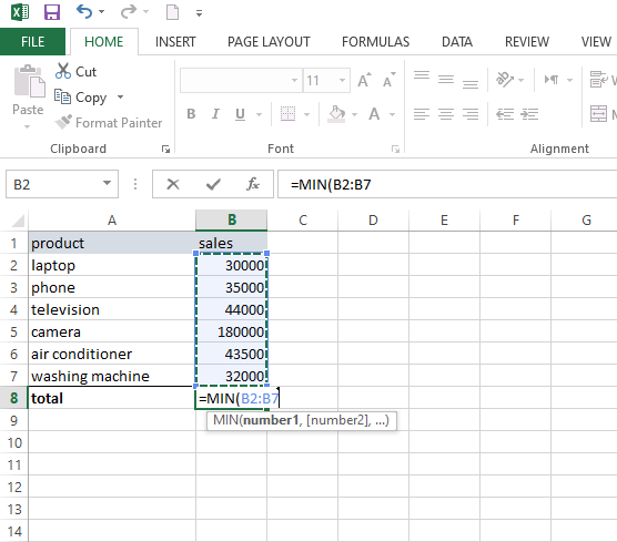 - البحث عن الحد الأدنى للرقم بين العمود B من B2 والعمود C من C2 إلى الصف 11 في كلا العمودين B و MIN (B2: C11) C=