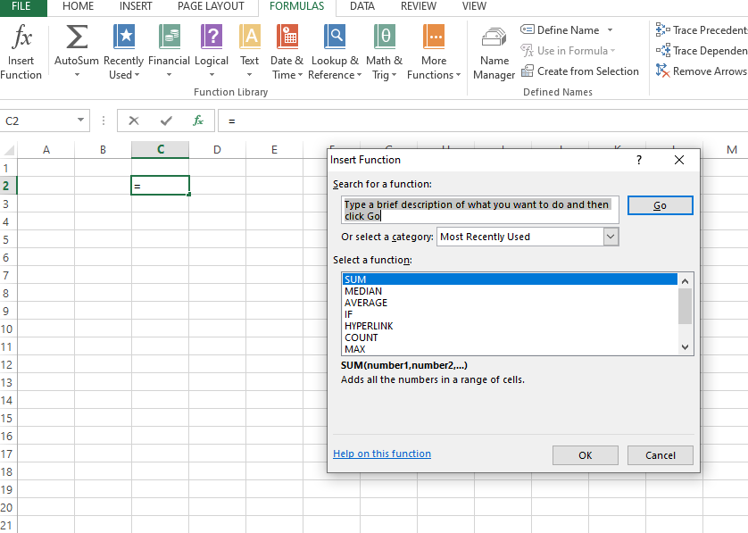 إذا كنت تريد التحكم الكامل في إدراج الدوال، فإن استخدام Excel Insert Function هو كل ما تحتاجه. لتحقيق ذلك، انتقل إلى علامة التبويب الصيغ وحدد القائمة الأولى المسماة إدراج دالة. سيحتوي مربع الحوار على جميع الدوال التي تحتاجها لإكمال تحليلك المالي.