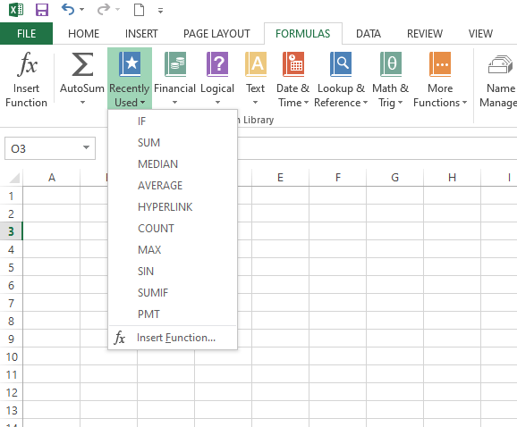 استخدم القائمة المستخدمة مؤخرًا. موجودة في علامة التبويب الصيغ، وهو خيار قائمة ثالث بجوار الجمع التلقائي.