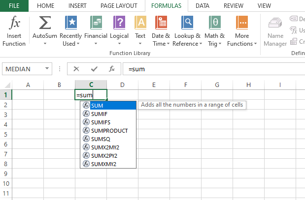 للعثور على هذه القائمة، انتقل إلى علامة التبويب الصيغ وحدد مجموعتك المفضلة. انقر لإظهار قائمة فرعية مليئة بقائمة من الدوال. من هناك، يمكنك تحديد ما تفضله.