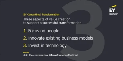 لقد حددنا في EY ثلاثة جوانب ديناميكية في صميم خلق القيمة التي ستدعم التحول الناجح. الأول هو وضع البشر في مركز كل شيء -يمكن أن يكون ذلك في شكل مركزية العميل أو مشاركة أعمق للموظفين. والثاني هو أن تكون مبتكرًا على نطاق أوسع ومستعدًا لإجراء تغييرات جذرية على نماذج الأعمال الحالية مع الحفاظ على ذكائك. والدافع الثالث لخلق القيمة هو أن تكون بارعًا في الاستفادة بسرعة من التقنيات الجديدة مثل الذكاء الاصطناعي والبلوك تشين وإنترنت الأشياء، والتي تؤثر على نماذج الأعمال، فضلاً عن نشر التكنولوجيا التي ستواكب توقعات العملاء والموظفين.