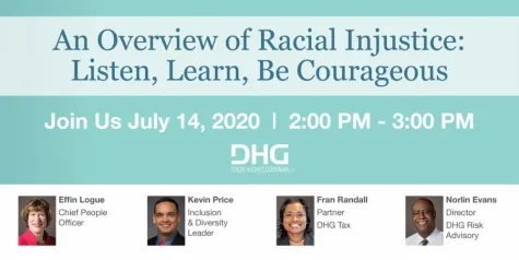 شركة دي اتش جي DHG ستظل ثابتة في الالتزام بتعزيز بيئة شاملة تقدر التنوع بجميع أنواعه. بينما نلفت انتباهنا إلى مشاكل العنصرية والظلم العنصري التي لم تحل منذ قرون ، نتفهم أهمية استضافة محادثات شجاعة خلال هذه الأوقات الصعبة بشكل خاص.