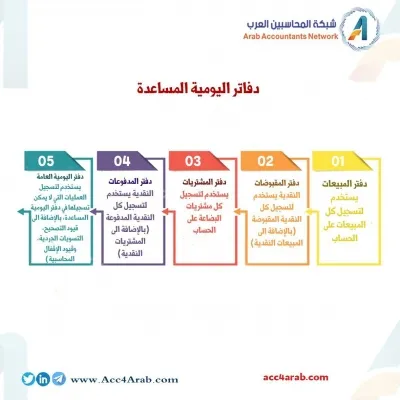 يتم استخدام دفتر اليومية المساعد لتسجيل أنواع العمليات المختلفة ويختلف نوع دفتر اليومية التي من منشأة لأخرى بناءاً على انواع العمليات التي تحدث بشكل متكرر في المنشأة. ومعظم المنشآت التجارية تستخدم دفاتر اليومية المساعدة لتسجيل عملياتها كما يظهر في الشكل التالي